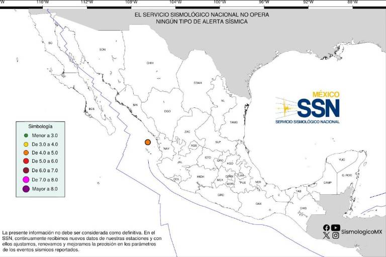 Se registra sismo de magnitud 4.4. a 169 km al suroeste de Mazatlán