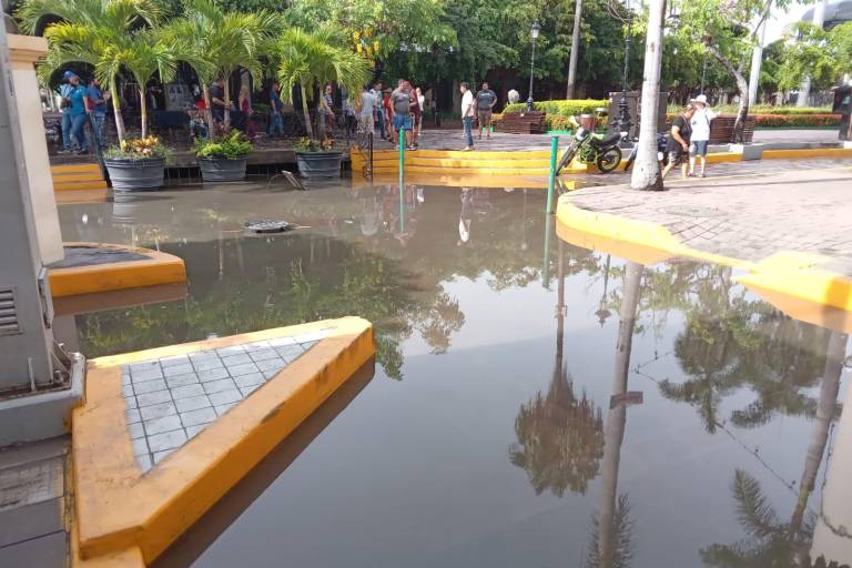Un taponamiento al libre flujo del agua pluvial y rebosamiento en una alcantarilla provocó la mañana de este viernes una inundación entre las calles Carnaval y Constitución, en una de las esquinas de la Plazuela Machado, en el Centro Histórico de Mazatlán.