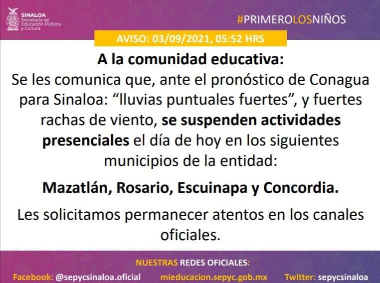 La Secretaría de Educación Pública y Cultura informa esta mañana la suspensión de clases en Mazatlán, Concordia, Rosario y Escuinapa por las lluvias que se registraron esta madrugada en el sur del estado.