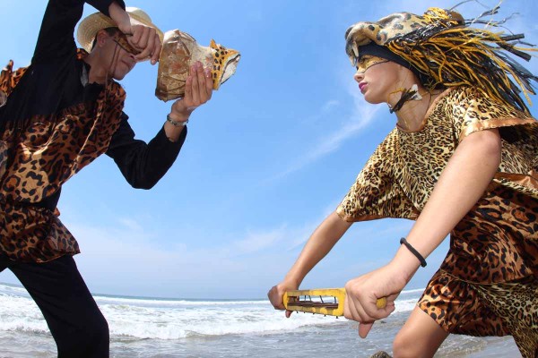 El sonido del jaguar suena entre las olas, los humanos salen a su acecho y comienza el baile de cacería para provocar el miedo en el felino.