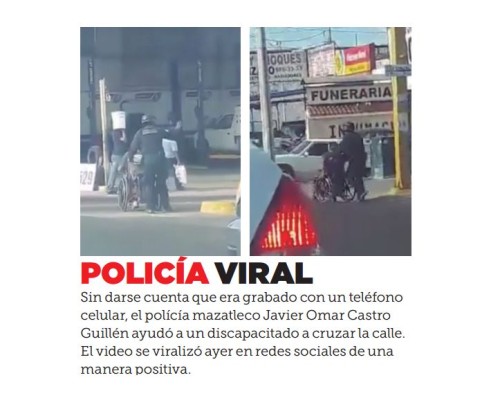 Sin darse cuenta que era grabado con un teléfono celular, el polícía mazatleco Javier Omar Castro Guillén ayudó a un discapacitado a cruzar la calle. El video se viralizó ayer en redes sociales de una manera positiva.