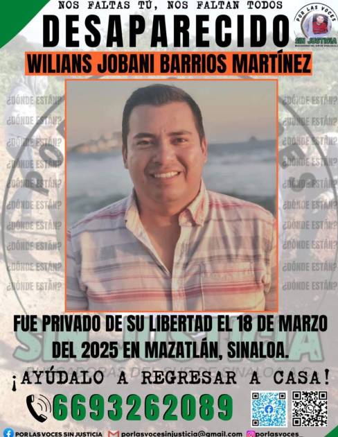La familia de Wilians Jobani Barrios Martínez lanzó un llamado urgente a la ciudadanía sinaloense para solicitar el apoyo que permita dar con su paradero, después de ser reportado como desaparecido desde el pasado 18 de marzo del 2025, en la comunidad de Villa Unión, del municipio de Mazatlán.