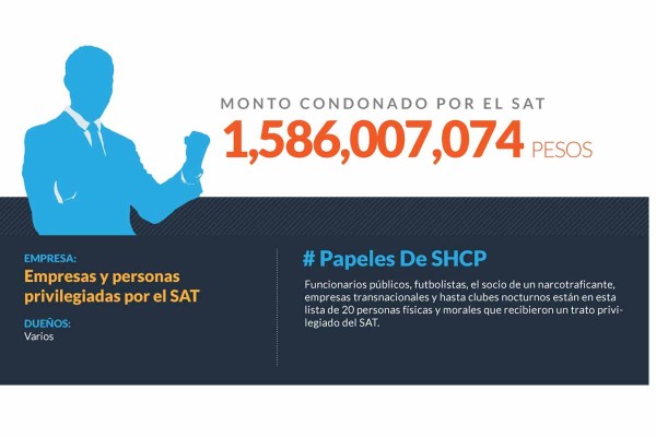 Las empresas y personas a las que el Sistema de Administración Tributaria les ha condonado créditos fiscales van desde corporaciones como Volkswagen y la asociación civil de Rafael Márquez –reconocido futbolista mexicano–, hasta un funcionario de la Secretaría de Desarrollo Económico y Turístico en Tampico, Tamaulipas, o un socio de Zhenli Ye Gon, acusado por narcotráfico.