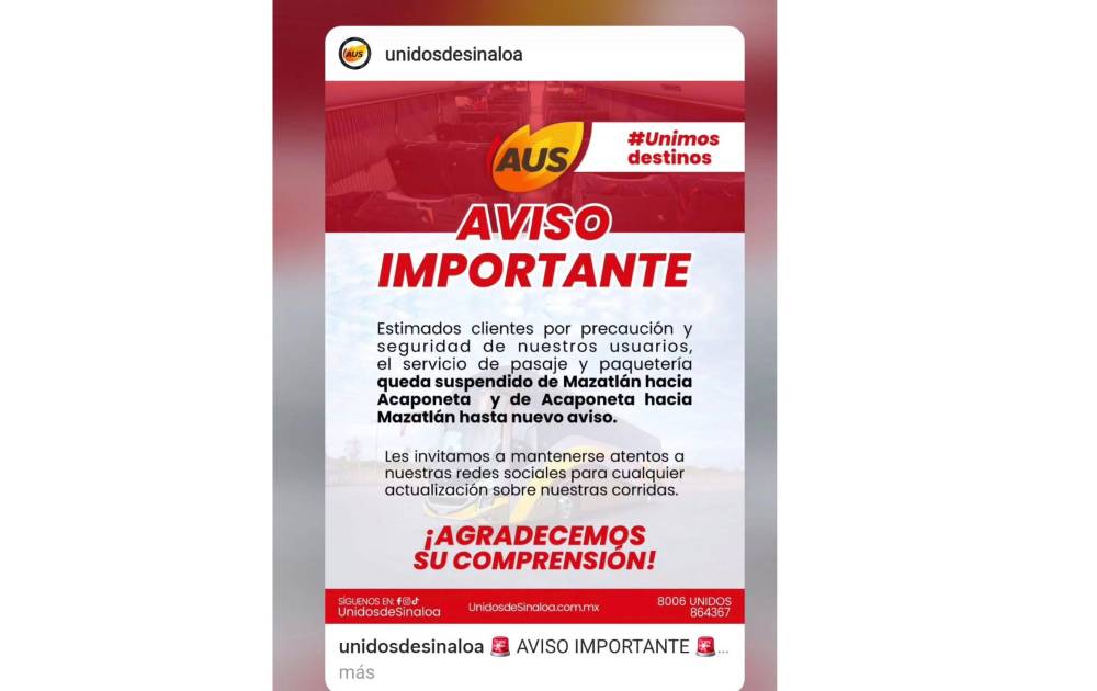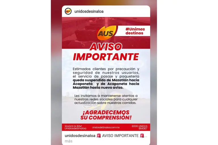 “Por precaución y priorizando la seguridad de nuestros usuarios, el servicio de pasaje y paquetería queda suspendido de Mazatlán hacia Acaponeta y de Acaponeta hacia Mazatlán hasta nuevo aviso”, dice el comunicado en redes sociales.
