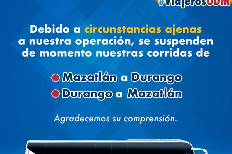 “Les informamos que las corridas de Mazatlán - Durango - Mazatlán se verán suspendidas hasta nuevo aviso.