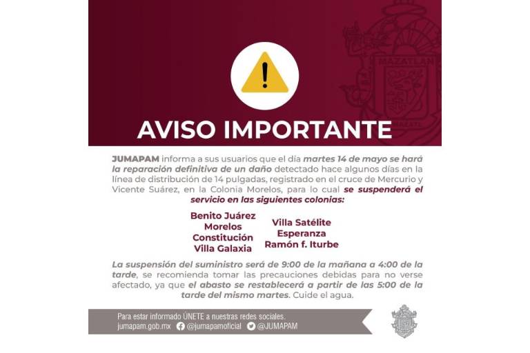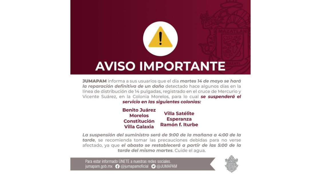 En el caso de las colonias Benito Juárez, Morelos, Constitución, Villa Galaxia, Villa Satélite, Esperanza y Ramón F. Iturbe la suspensión será de 09:00 a 16:00 horas, esto por la reparación definitiva de la línea de distribución de 14 pulgadas, cuyo daño fue detectado en el cruce de Mercurio y Vicente Suárez en la colonia Morelos.