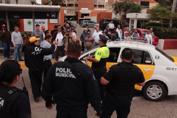 MAZATLÁN._ A punto de llegar a los golpes estuvieron taxistas y agentes municipales, luego de que estos últimos auxiliaron a unos turistas que fueron bloqueados por los trabajadores del volante, cuando eran trasladados al Aeropuerto Internacional de Mazatlán en una unidad de Atamsa, en un hotel de la Zona Dorada.