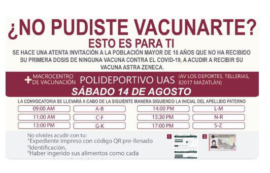 Este sábado 14 de agosto habrá jornada de vacunación contra el Covid-19 para las personas de 18 años en adelante en Mazatlán, informó el Gobierno federal.