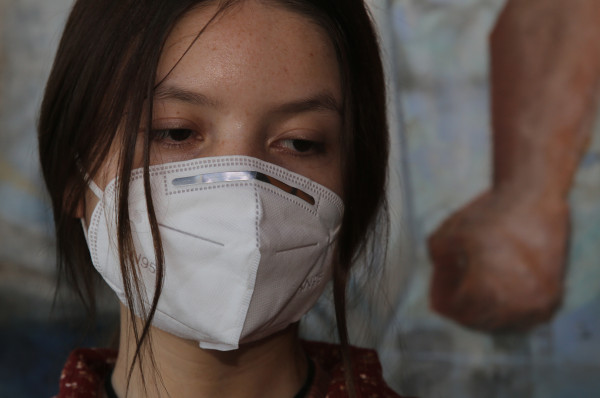 Giovanna Xenia, ataviada con cubrebocas, asiente la cabeza para confirmar lo que el familiar revela.