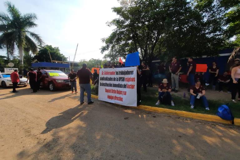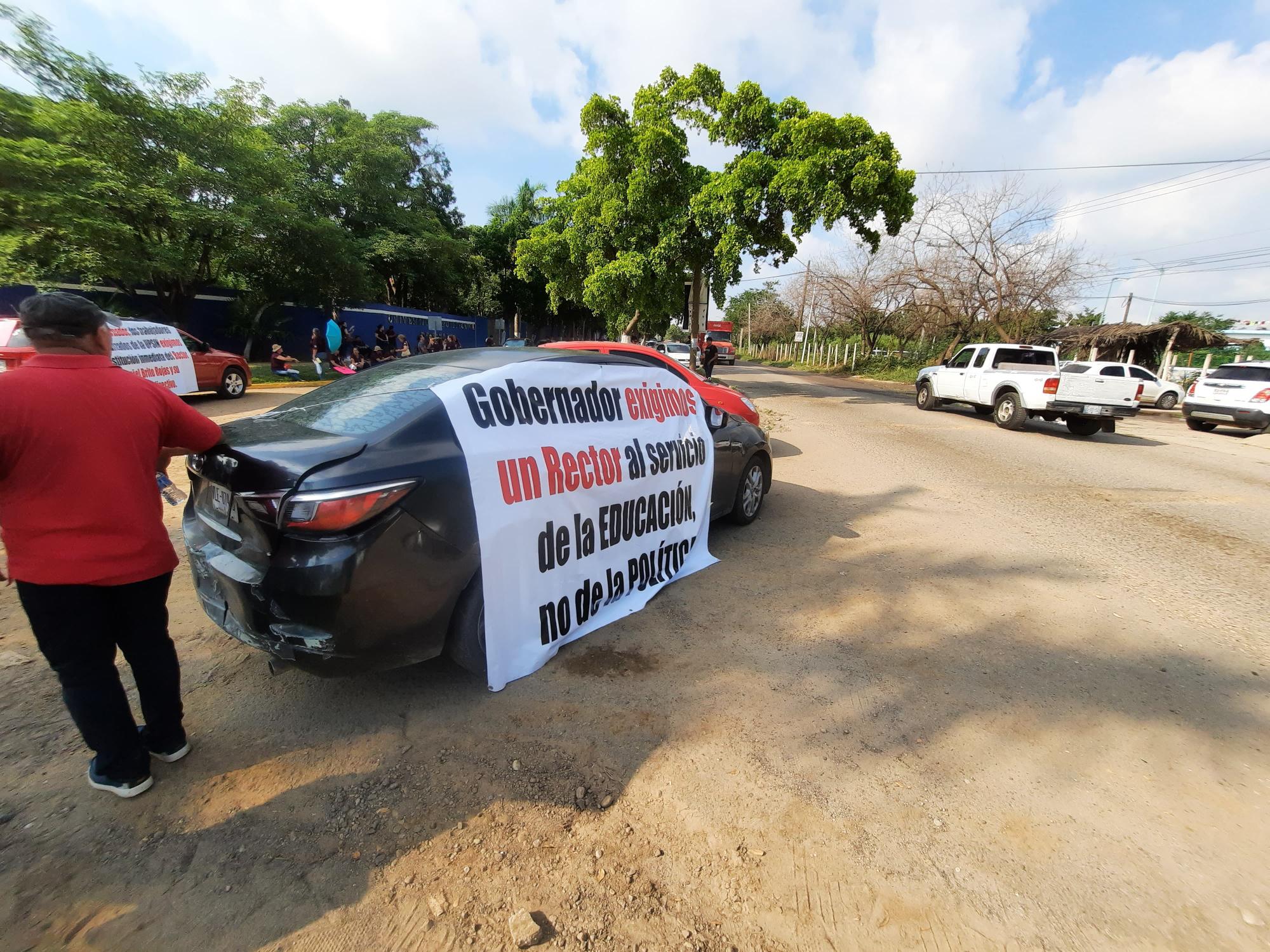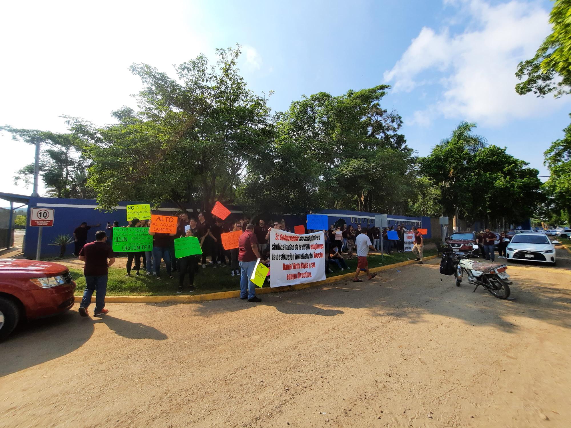 MAZATLÁN._ Con pancartas, letreros y gritos, decenas de trabajadores y administrativos del Sindicato de Trabajadores del Servicio del Estado se manifestaron a las afueras de las instalaciones de la Universidad Politécnica de Sinaloa contra supuestos abusos cometidos por su Rector, Héctor Daniel Rojas Brito.