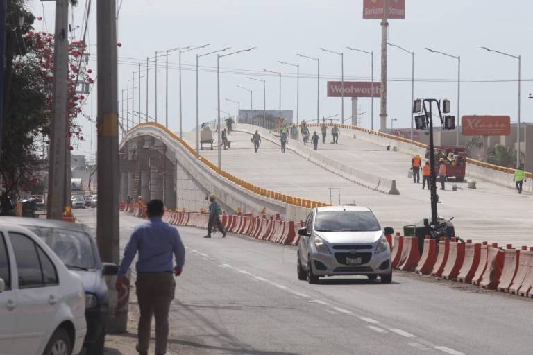 Tras el incidente, el cual dejaron en manos de las autoridades, los encargados de la obra mantienen el buen ritmo de construcción del puente, mostrando avances importantes como las luminarias ya colocadas en toda la zona superior de la vialidad y una pavimentación casi completada.
