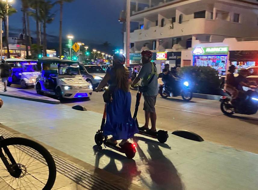 Portando sus respectivos cascos, chalecos y rodilleras, visitantes y locales pasaron una agradable tarde noche de domingo en el parador turístico de las Letras de Mazatlán, donde es más común ver a usuarios de scooters pasear por la ciclovía en familia o pareja.