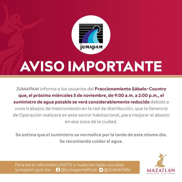 A través de un comunicado en sus redes sociales, la Junta Municipal de Agua Potable y Alcantarillado de Mazatlán (Jumapam) anunció que este miércoles 5 de noviembre, los vecinos del Fraccionamiento Sábalo Country verán afectado su suministro de agua.