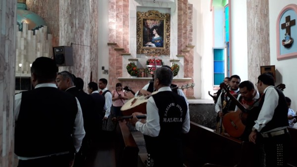 A sus pies, alrededor de 40 músicos pertenecientes a los mariachis Juvenil Mazatlán, Continental y Sinaloa le ofrendaron la pieza El Ángel, que es una oración que enaltece la encarnación de Cristo en la Virgen María, ellos fueron los encargados de adornar la misa con su cánticos y la interpretación de las diferentes partes de la misa, como fueron Señor ten piedad, Aleluya, Santo, Padre nuestro que le dieron al rito litúrgico una atmósfera de alegría.