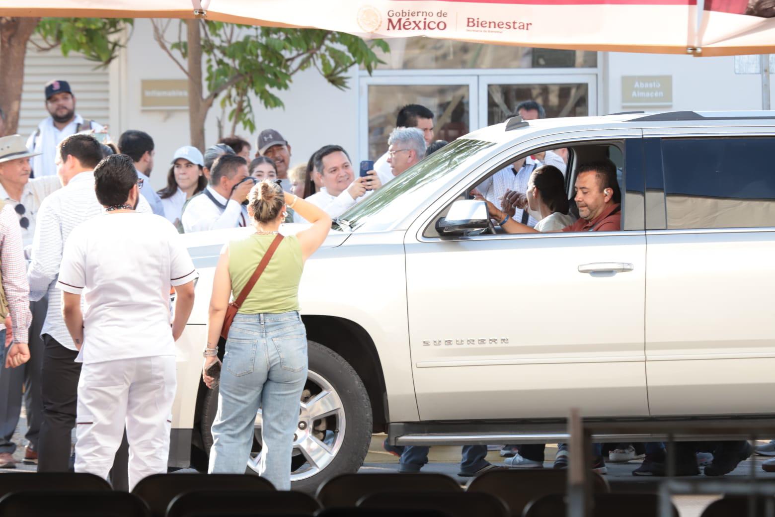 Minutos más tarde arribó el Gobernador de Sinaloa, Rubén Rocha, Moya, el cual, a diferencia de la Alcaldesa, atendió por un escaso momento a las personas que buscaban tener un acercamiento con él, entre las cuales se encontraban tanto simpatizantes como manifestantes, a los que les recibió sus peticiones.