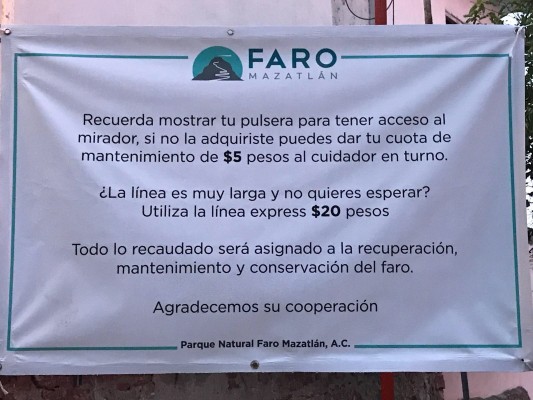 Esta tarifa en esta fila "VIP" ha sido fijada por el propio patronato que dirige la asociación civil Parque Natural del Faro Mazatlán.