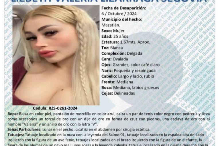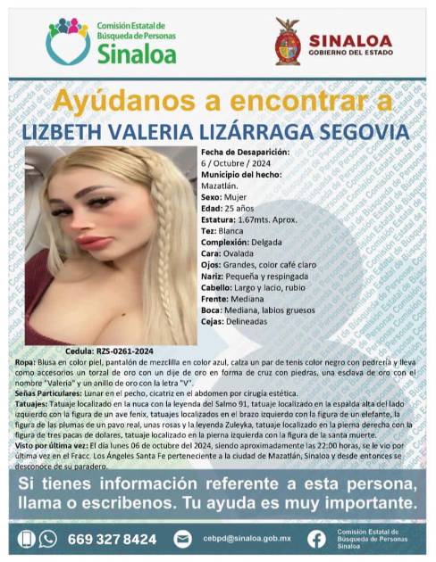 Lizbeth Valería Lizárraga Segovia, de 25 años de edad, desapareció el pasado domingo 6 de octubre, se le vio por última vez en el Fraccionamiento Los Ángeles Santa Fe, en la zona sur de Mazatlán, Sinaloa.