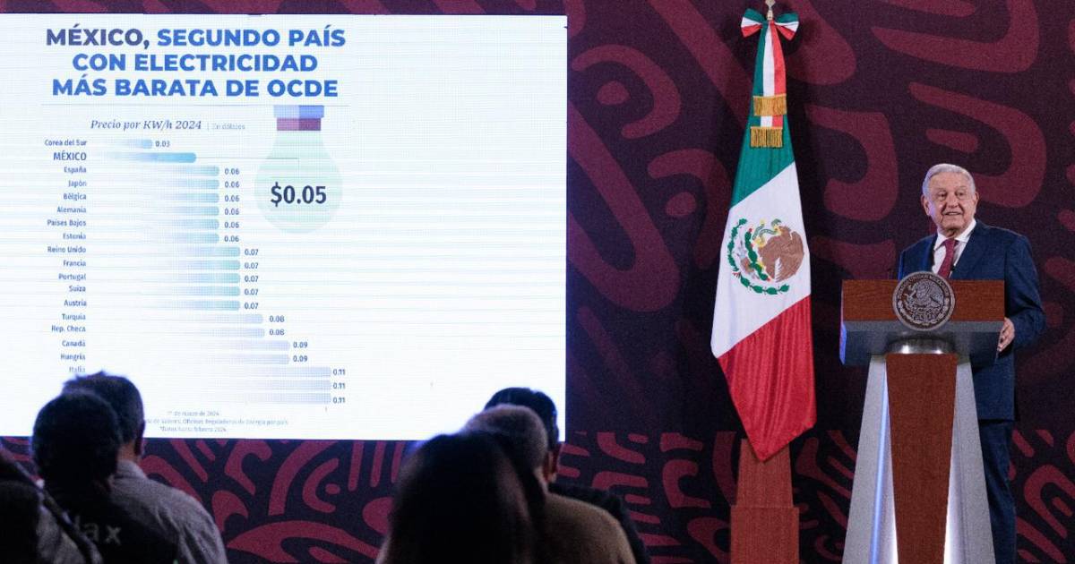 “Es por lo de, nada más es esto, para que todos los mexicanos y esto ayuda mucho para el ‘¿Quién es quién en los precios?’”, detalló el mandatario nacional, mientras señalaba la gráfica titulada ‘México, segundo país con electricidad más barata de OCDE’.