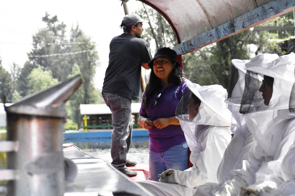 Abejas de Barrio invita constantemente a niñas, niños y personas adultas a charlas y a conocer de cerca el trabajo de apicultura que realizan sobre una chinampa, un modelo de cultivo y expansión territorial flotante que sigue en pie gracias a sus habitantes. Su experiencia les ha llevado a colaborar en encuentros con otros productores y con estudiantes desde el nivel básico hasta de educación superior de la Ciudad de México y otros estados, como Oaxaca e Hidalgo.