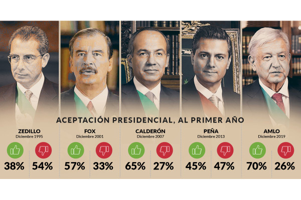 López Obrador cerró diciembre de 2019 con un 70 por ciento promedio de aceptación y con un 26 por ciento que desaprueba su mandato.