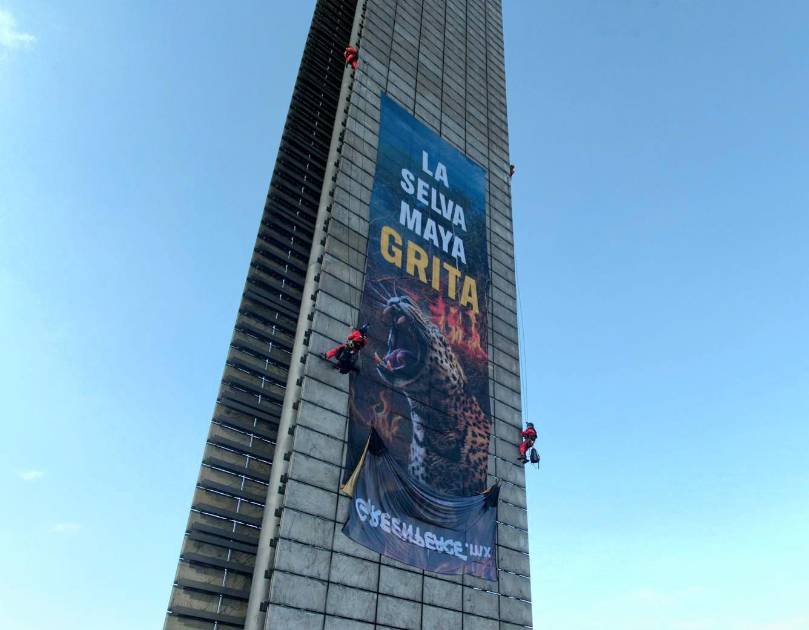 Activistas de la organización ambiental Greenpeace México escalaron el monumento de la Estela de Luz con el objetivo de visibilizar “la devastación de la Selva Maya” y exigir al Gobierno medidas para su protección.