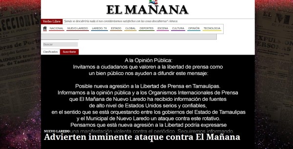 "Posible nueva agresión a la libertad de prensa en Tamaulipas, informamos a la opinión pública y a los organismos internacionales de prensa que El Mañana de Nuevo Laredo ha recibido información de fuentes de alto nivel de Estados Unidos, serios y confiables en el sentido de que se está orquestando entre los gobiernos del estado de Tamaulipas y el Municipal de Nuevo Laredo un ataque contra este rotativo; pensamos que esta nueva agresión a la libertad podría expresarse con una manifestación violenta contra el periódico", publicó el diario como su nota principal.