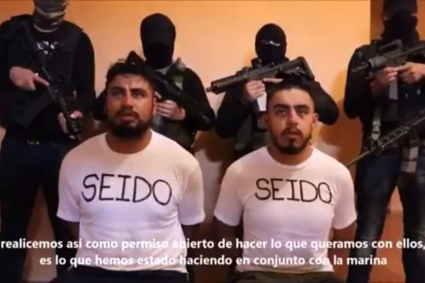 En las imágenes se observa a Hernández Villavicencio y a Martínez Quiroz, hincados y con las manos por la espalda, mientras son amenazados por cuatro hombres con el rostro cubierto, quienes les apuntan con armas largas y los obligan a leer un mensaje.