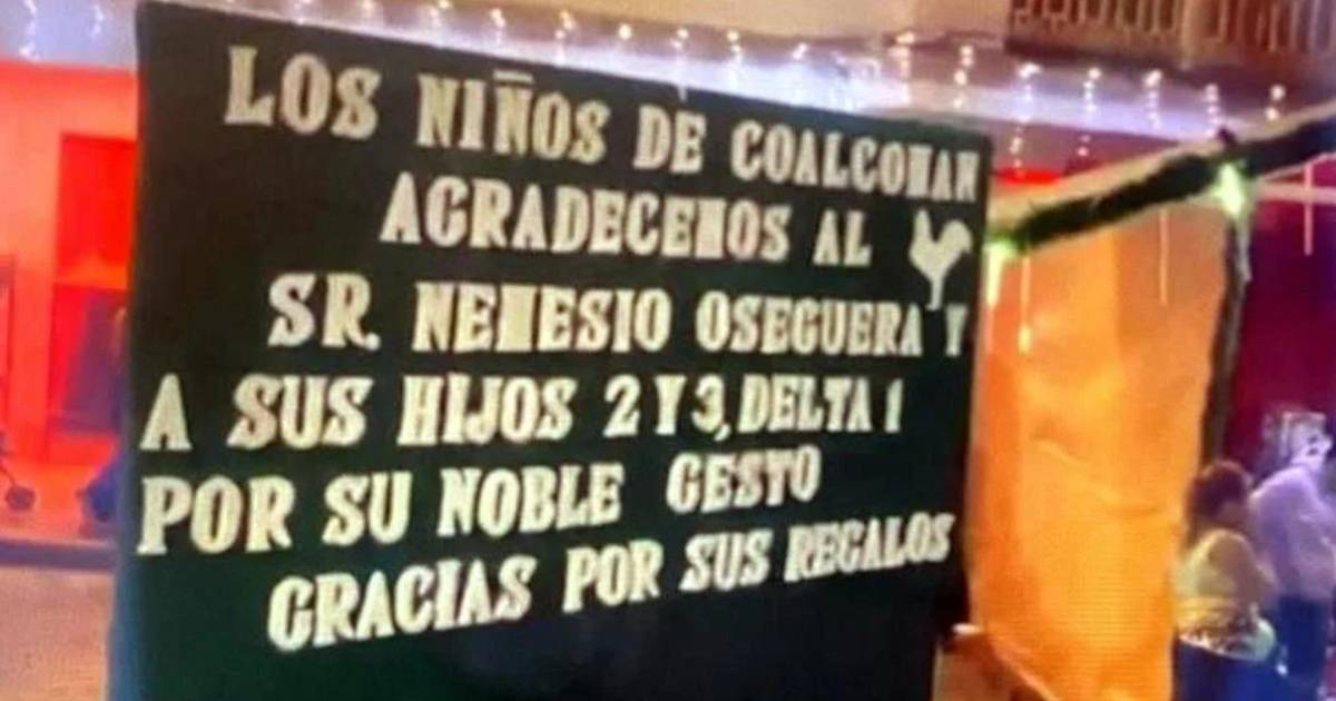 “Los niños de Coalcomán agradecemos al Sr. Nemesio Oseguera, a sus hijos 2 y 3, Delta 1 por su noble gesto. Gracias por sus juguetes”, decía una manta colgada en una estructura, durante un evento público, llevado a cabo el 10 de diciembre de 2024.