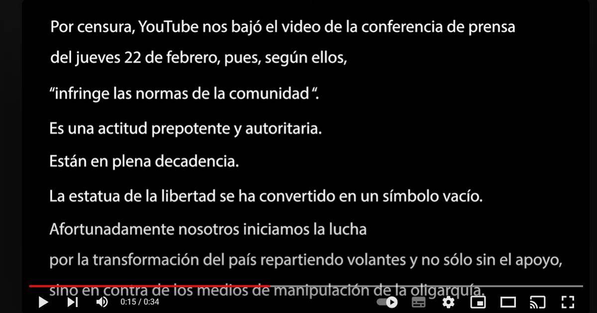 “Por censura, YouTube nos bajó el video de la conferencia de prensa del jueves 22 de febrero, pues, según ellos, ‘infringe las normas de la comunidad’. Es una actitud prepotente y autoritaria. Están en plena decadencia. La estatua de la libertad se ha convertido en un símbolo vacío”, señaló.