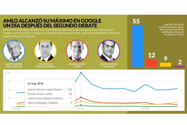 En este lapso su mejor cifra la alcanzó el 22 de mayo, un día después del segundo debate: obtuvo 100 puntos, la máxima cantidad a la que se puede llegar en la herramienta Google Trends, que muestra la frecuencia con la que un usuario busca el nombre de un candidato en dicho buscador, no la intención del voto.
