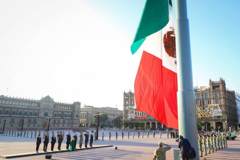 El Mandatario caminó desde Palacio Nacional hasta el asta bandera de la Plaza de la Constitución, donde realizó honores a la bandera y se entonó el Himno Nacional.