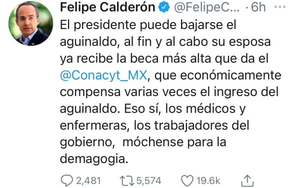 “El Presidente puede bajarse el aguinaldo, al fin y al cabo su esposa ya recibe la beca más alta que da el @Conacyt_MX, que económicamente compensa varias veces el ingreso del aguinaldo”, tuiteó.