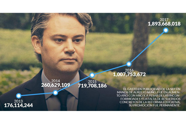 De acuerdo con la solicitud 0001100573218 dirigida a la SEP, de 2013 a 2017 el gasto en publicidad creció 975 por ciento. Ese primer año, cuando la Secretaría estuvo en manos de Emilio Chuayffet Chemor, se pagaron 176 millones 114 mil 244 pesos. Con Aurelio Nuño Meyer, en su último año de gestión, dejó el gasto en mil 893 millones 668 mil 018 pesos.