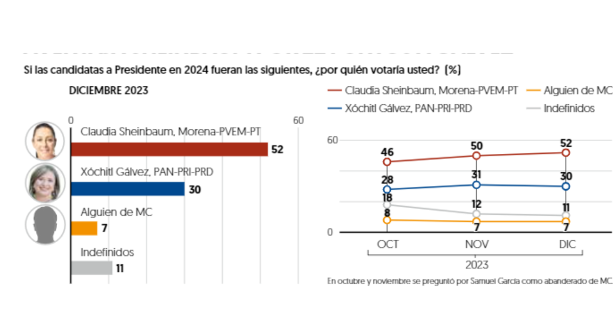 Claudia Sheinbaum, virtual candidata de Morena, PT y PVEM a la Presidencia de la República, terminó el 2023 con una ventaja de 22 puntos porcentuales en la intención de voto sobre Xóchitl Gálvez, quien representa a la coalición formada por PAN, PRI y PRD, de acuerdo con una encuesta de El Financiero realizada en diciembre.