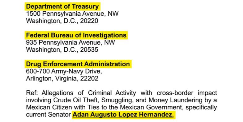 “Ref.: Denuncias de actividad delictiva con impacto transfronterizo relacionadas con el robo, contrabando y lavado de dinero de petróleo crudo por parte de un ciudadano mexicano vinculado al gobierno mexicano, específicamente el actual senador Adán Augusto López Hernández”, dice el texto del documento presentado por Moreno Cárdenas.