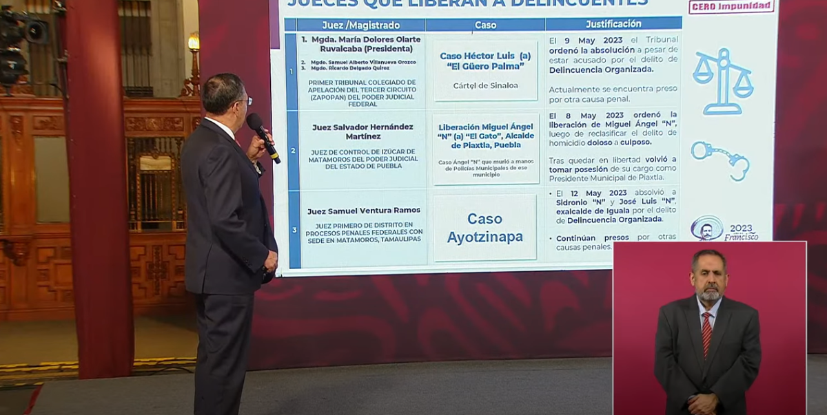El funcionario federal relató que el citado Tribunal Colegiado de apelación, integrado por los magistrados María Dolores Olarte Ruvalcaba, Samuel Alberto Villanueva Orozco y Ricardo Delgado Quiróz, ordenó el 9 de mayo de 2023, la absolución de “El Güero” Palma, a pesar de estar acusado por el delito de delincuencia organizada.