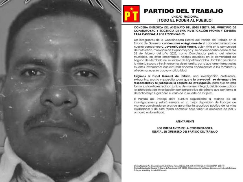 Juvenal Calleja Peralta, dirigente del Partido del Trabajo (PT) en Copanatoyac, Guerrero, fue asesinado junto a su esposa y tres integrantes de su familia durante un ataque armado en Zapotitlán Tablas.