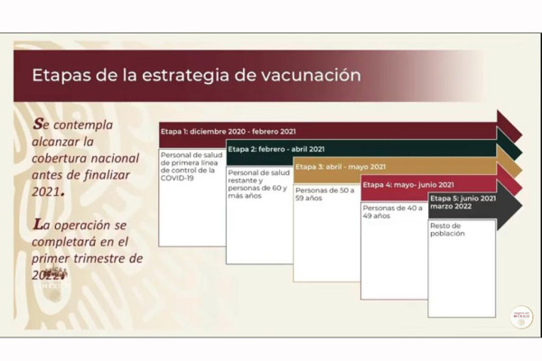 Mientras que la cuarta etapa de la estrategia de vacunación en México, se llevará a cabo de mayo a junio del 2021, y, la última etapa de junio del próximo año a marzo del 2022, para el resto de la población.