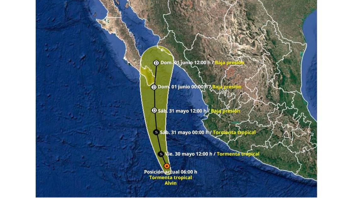 Según el pronóstico de la evolución de la tormenta tropical Alvin, al mediodía de este sábado estaría perdiendo intensidad hasta convertirse en una baja presión, continuando su trayectoria hacia el norte de Sinaloa, donde tocaría tierra el domingo.