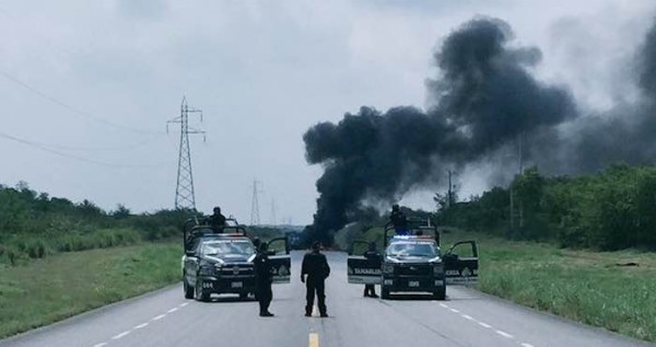 En reacción a la movilización policial decenas de personas bloquearon la carretera con vehículos pesados, que incluyó la quema de un tractocamión a la entrada del municipio de Hidalgo.