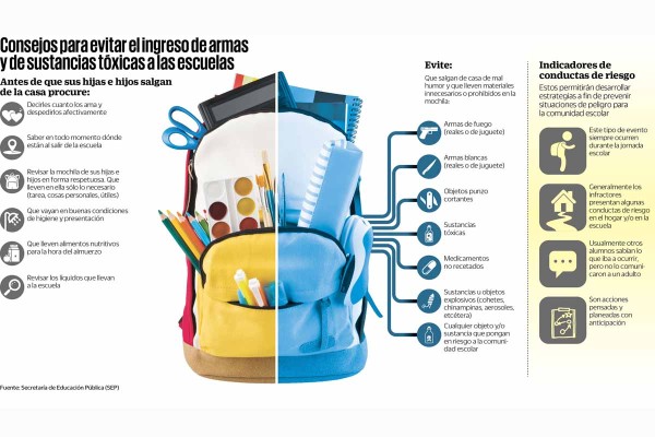 A partir de este lunes, la secretaría difundirá ocho consejos para que los padres de familia eviten que los niños y adolescentes lleven a la escuela “armas de fuego (reales o de juguete), armas blancas, objetos punzocortantes, sustancias y objetos explosivos (cohetes, chinampinas, aerosoles), sustancias tóxicas, medicamentos no recetados, así como objetos y sustancias que pongan en riesgo a la comunidad escolar”.