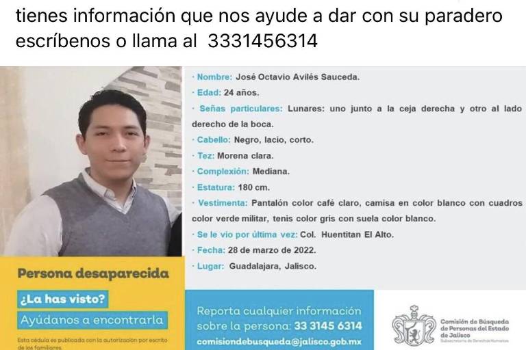 La ficha de la Comisión de Búsqueda de Jalisco difunde las características de José Octavio, quien tiene 24 años, se encontraba en Guadalajara, tiene el cabello negro, lacio y corto y de tez morena clara.