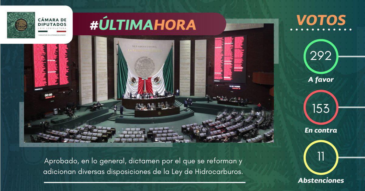 Con 292 votos a favor, 153 en contra y 11 abstenciones, el Pleno de la Cámara de Diputados del Congreso de la Unión aprobó este miércoles la reforma a la Ley de Hidrocarburos que propuso el Presidente Andrés Manuel López Obrador.