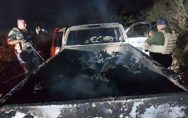 TAMAULIPAS._ El viernes 22 de enero, policías estatales encontraron en un camino de terracería, cerca de Camargo, una camioneta con 19 cuerpos calcinados en su interior: dos cuerpos en la cabina, un par más a cada lado del piloto y copiloto y 15 en la caja de la camioneta. Allí mismo encontraron una placa de Nuevo León.