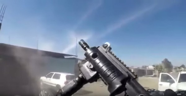 En el video se observa arribar tres camionetas pick ups, con hombres encapuchados, gorras negras y chalecos antibalas, quienes sin mediar palabras atacan a sus enemigos con subametralladoras fabricadas por la armería alemana Heckler and Koch.