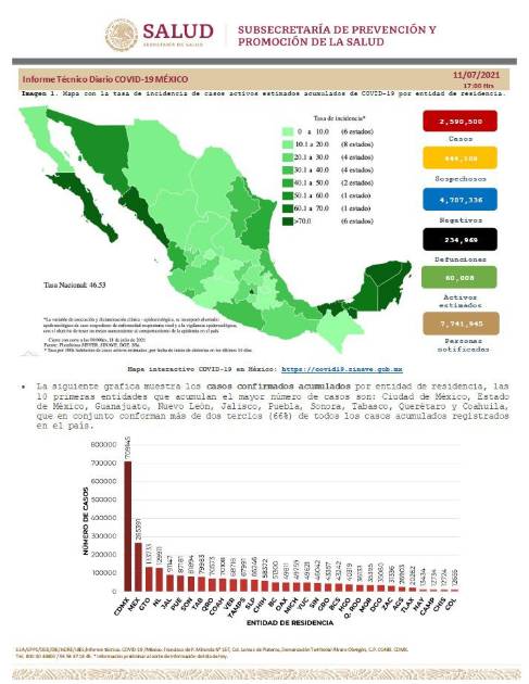 La Ciudad de México (20 mil 800), el Estado de México (4 mil 849), Sinaloa (3 mil 604), Veracruz (2 mil 594) y Baja California Sur (2 mil 504) son las entidades con más casos activos, mientras que Tlaxcala (73), Aguascalientes (89), Chiapas (178), Morelos (197) y Zacatecas (201) reportan menor cantidad de contagios.