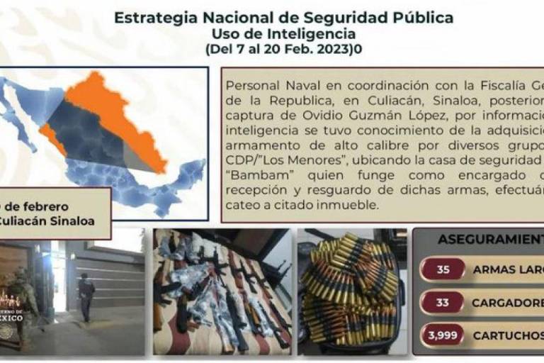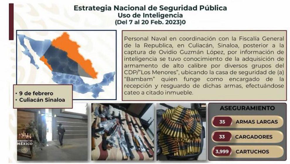 Durante la conferencia de prensa matutina presidencial de este martes, el almirante dio a conocer el aseguramiento de armamento de alto calibre que se encontraba en posesión del grupo delincuencial liderado por el hijo de Joaquín “El Chapo” Guzmán, detenido el 5 de febrero en Sinaloa.