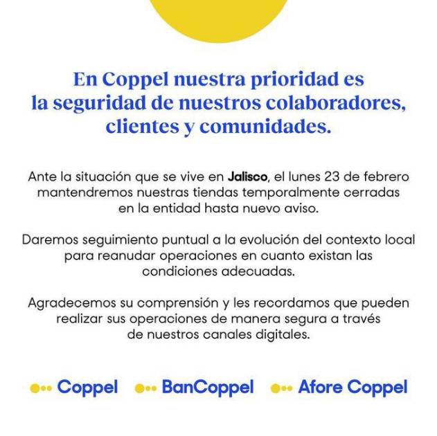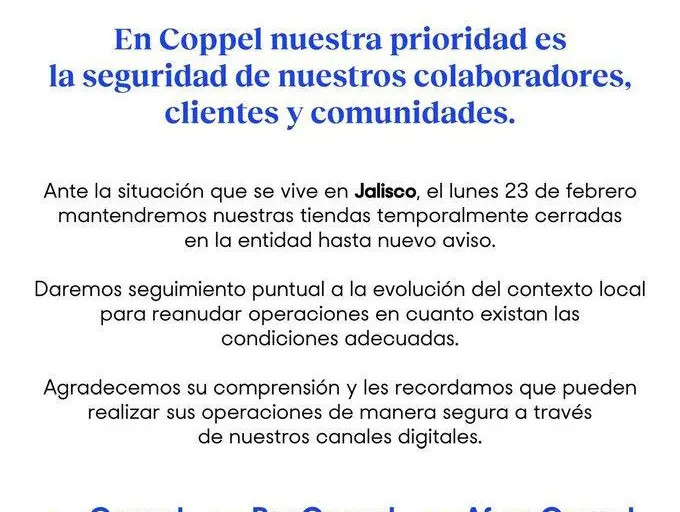 “En Coppel nuestra prioridad es la seguridad de nuestros colaboradores, clientes y comunidades”, señala el posicionamiento difundido por la compañía, en el que también se indica que se dará seguimiento puntual a la evolución del contexto local para reanudar operaciones en cuanto existan condiciones adecuadas.