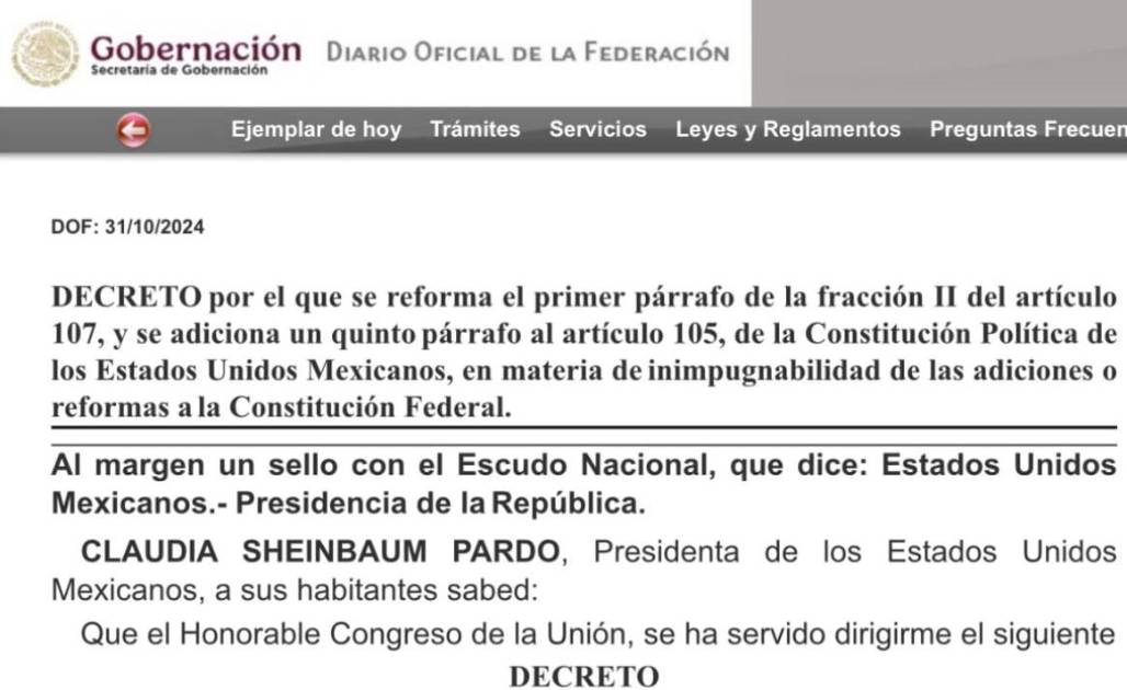 La Presidenta Claudia Sheinbaum Pardo publicó la noche del 31 de octubre, en el Diario Oficial de la Federación, el decreto que reformó el artículo 107 y adicionó un quinto párrafo al artículo 105 de la Carta Magna.