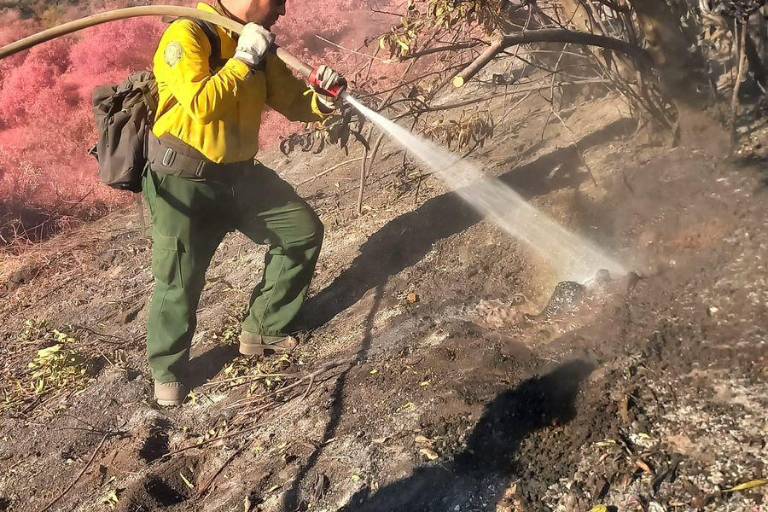 Conafor reportó en el área de Temescal Canyon, Fire Rd (División Zulu) realizó la ampliación de brecha con motosierra y herramientas manuales en 300 metros.